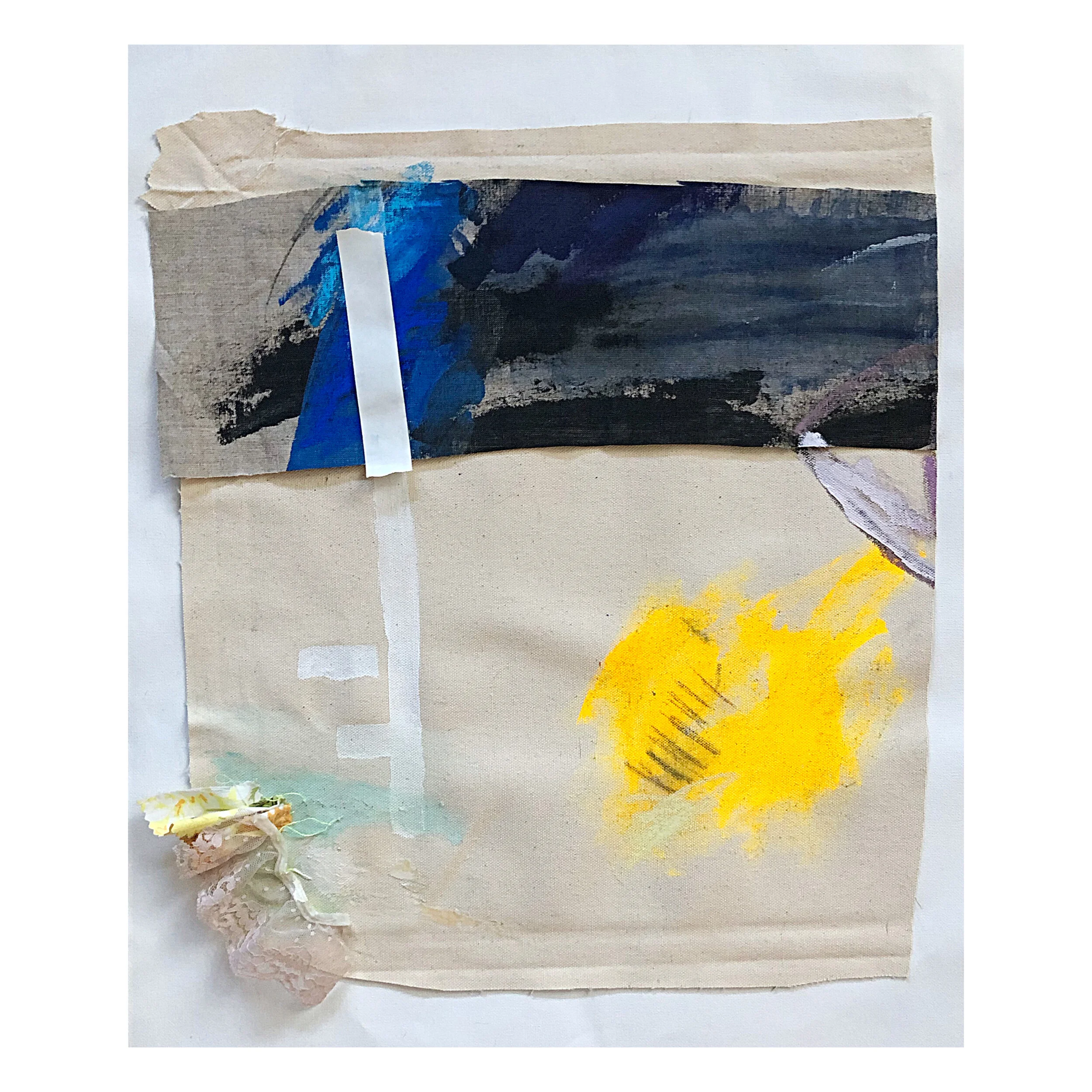 tape, acrylic, pastel, graphite, oil stick, linen, vintage fabric, lace, thread collage on canvas