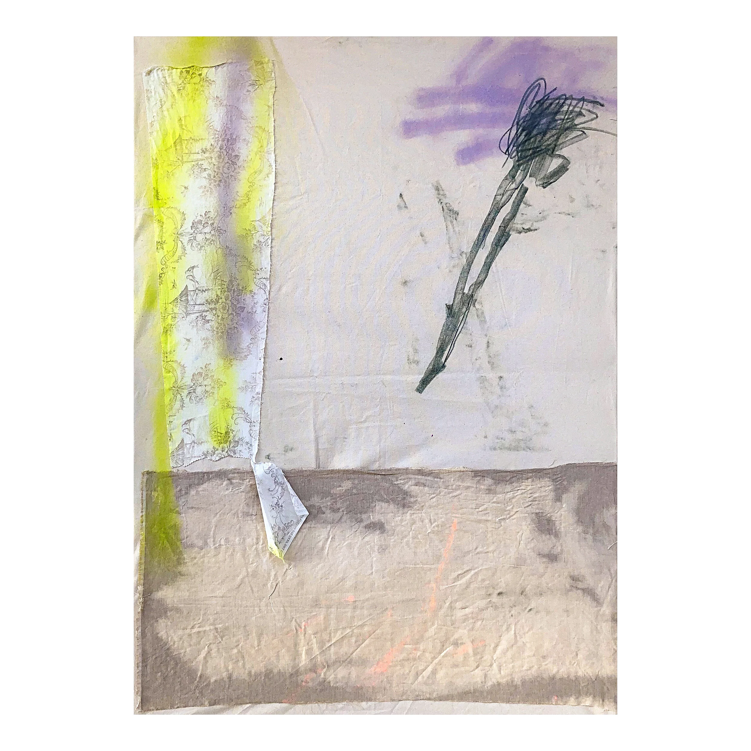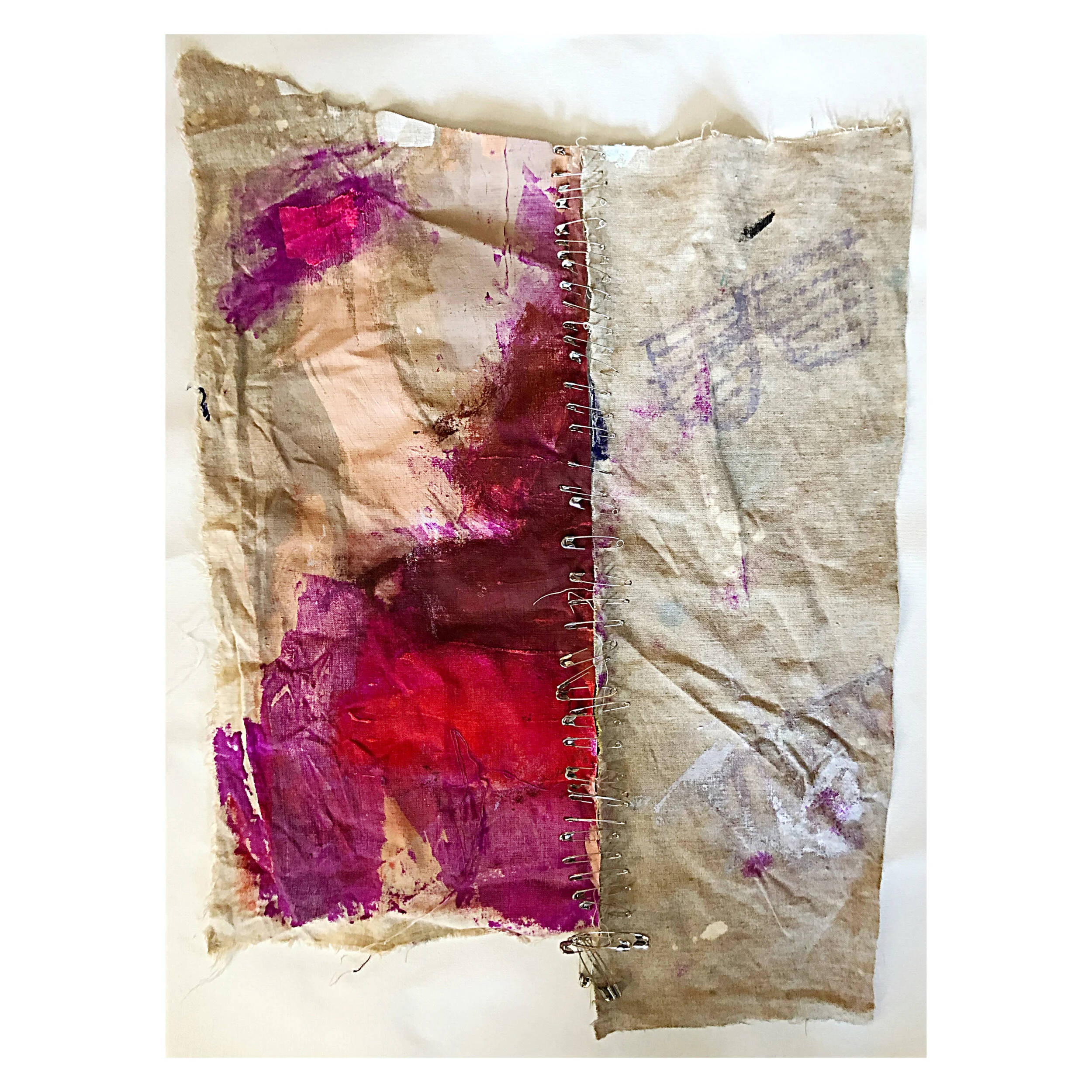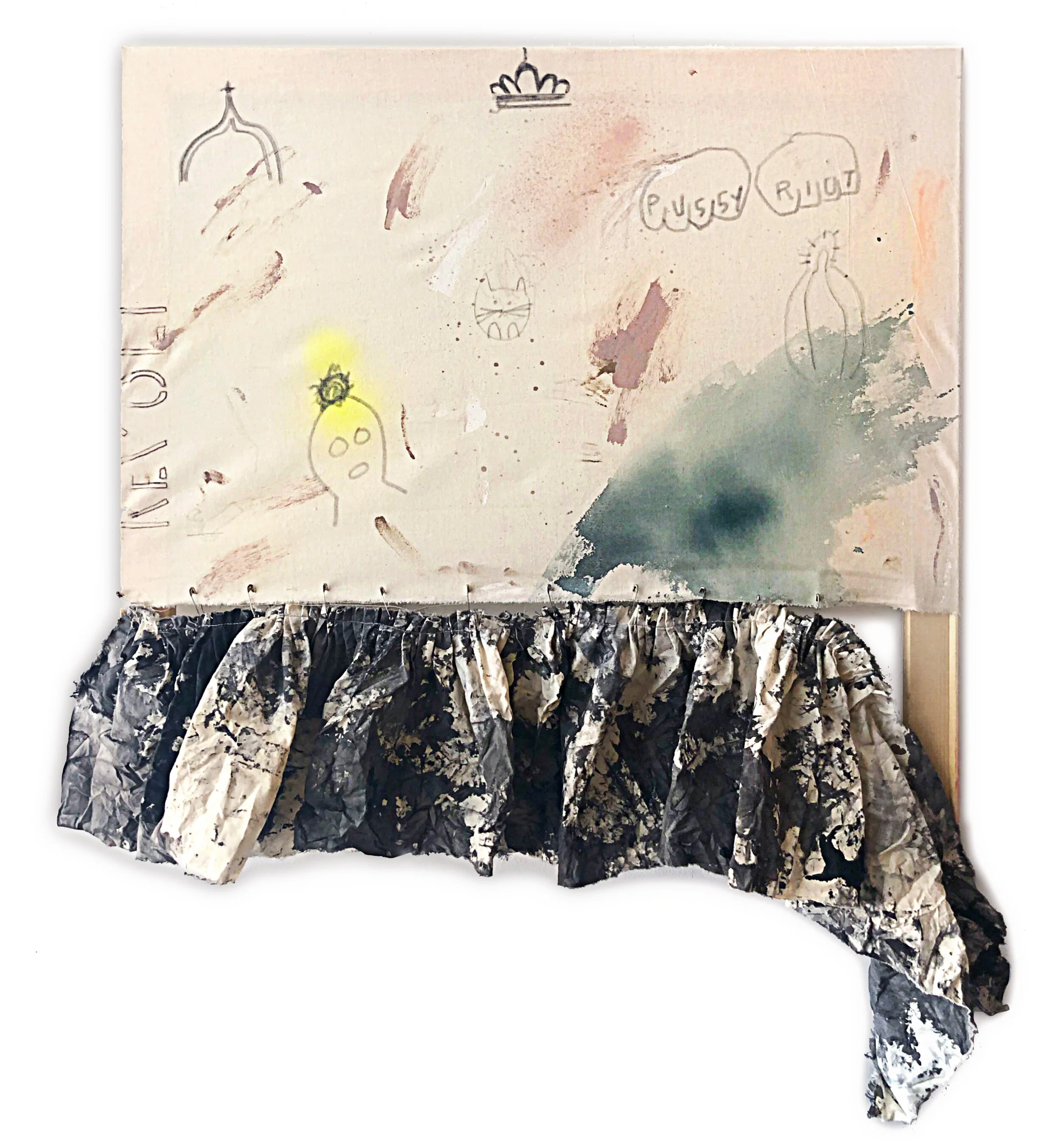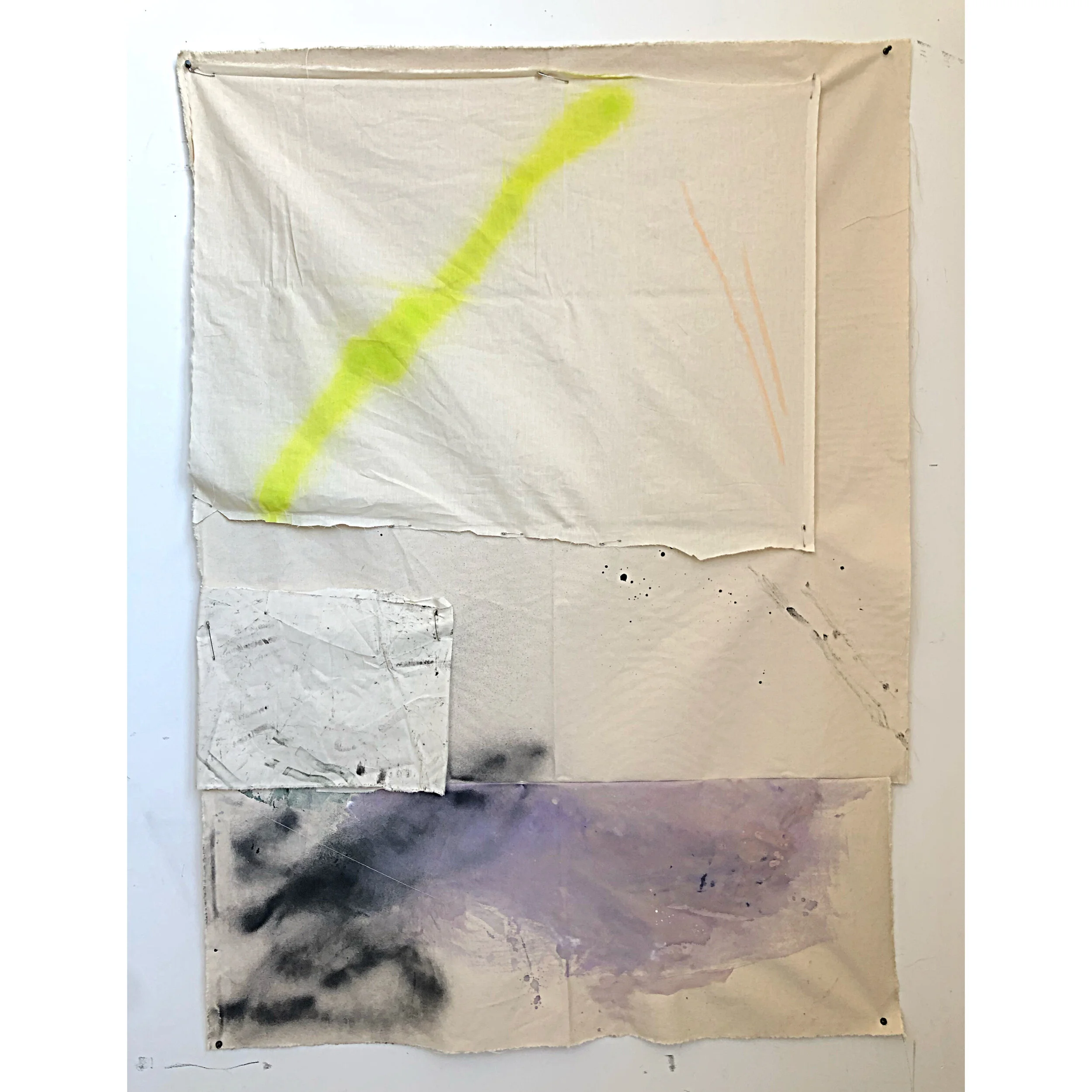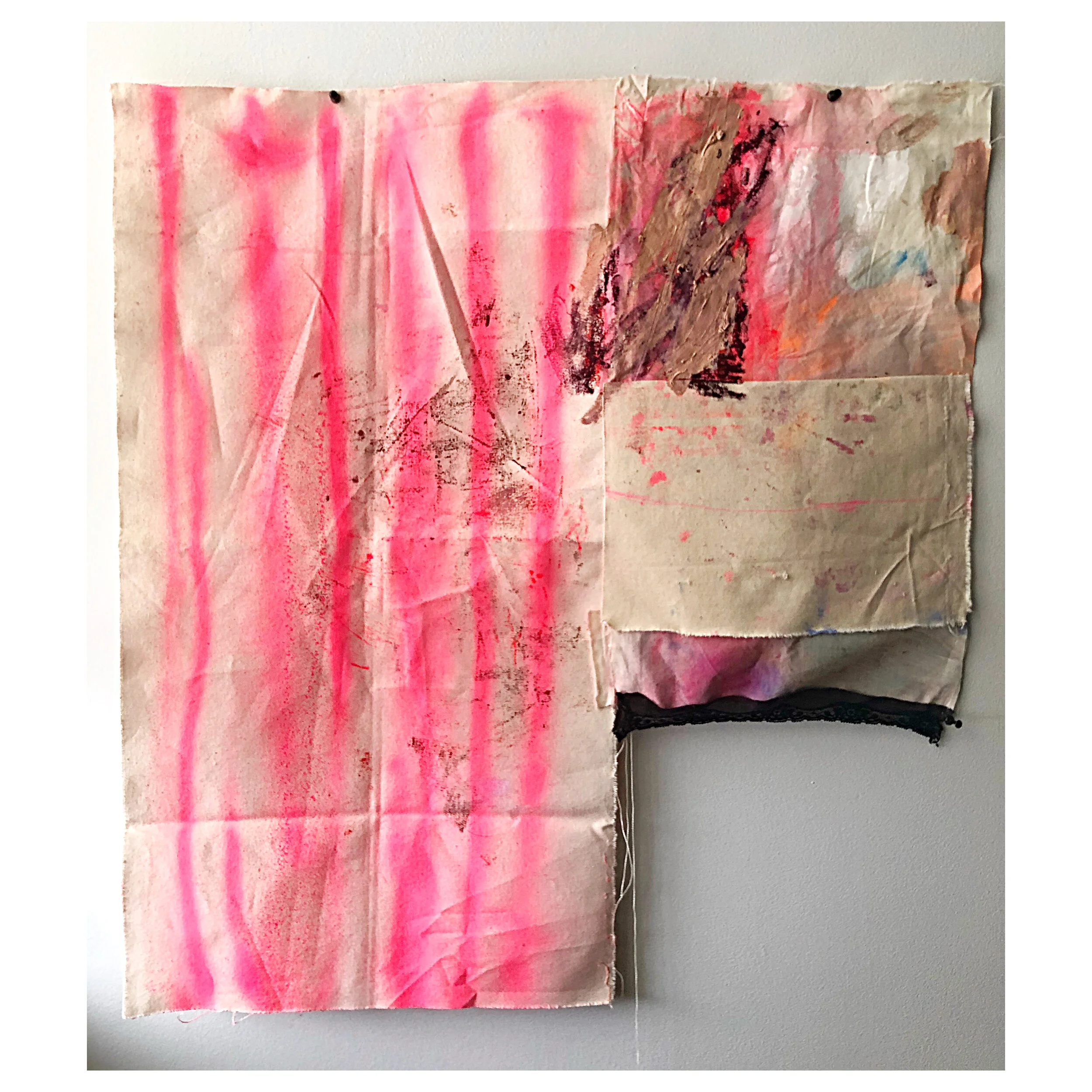 In this new body of work Iām thinking about Queer Utopias, subverting a heteronormative status quo dreaming of joyful futuristic spaces full of possibility. I use my identity as a queer feminist artist to examine the tension between material/emotion, and language/memory as I cut up old paintings and reconfigure them into something new. Mixing and experimenting with different materials, such as spray paint, bleach and safety pins, in addition to the inclusion of text and drawing allows for a tension and spontaneity in how they react to one another; a push-pull in exploring the visceral in the painterly.